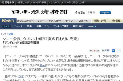 ・ソニー会長、タブレット端末「夏の終わりに発売」:日本経済新聞