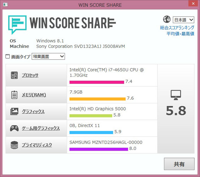 「WIN SCORE SHARE」で簡易ベンチマークをチェックすると以下のとおり。